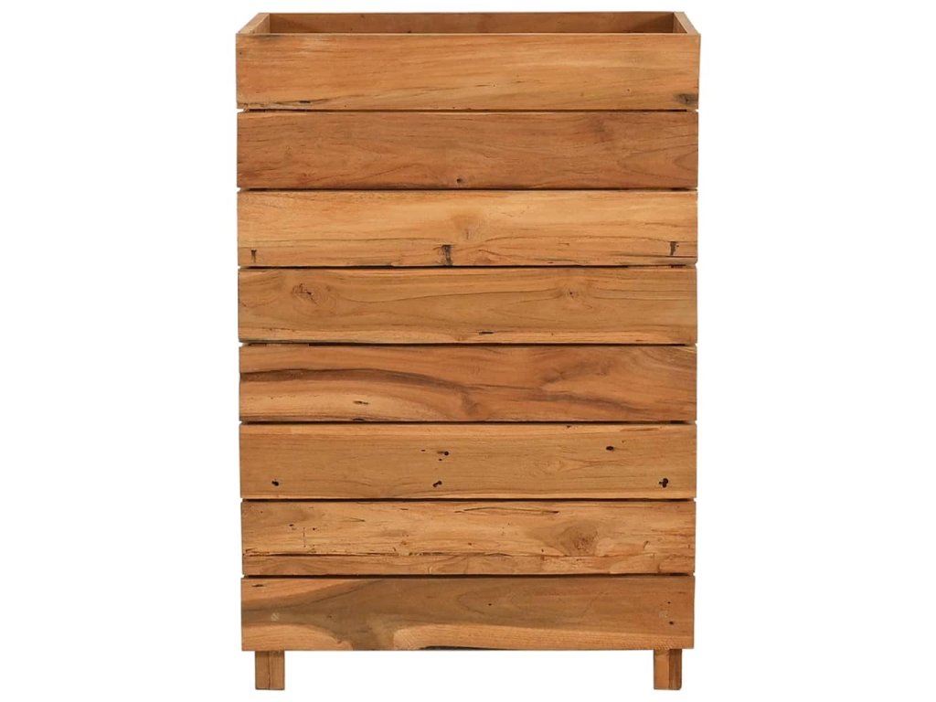 Truhlík je vyrobený z recyklovaného teaku, je tudíž velmi robustní a má dlouhou životnost. Krásná kresba dřeva je vždy jedinečná, a proto je i každý truhlík originální kus, lehce odlišný od všech ostatních. Čtyři dřevěné nohy zlepšují jeho stabilitu. Dno truhlíku je dále vybavené ocelovou podložkou, kterou lze umístit do 2 různých úrovní, takže si snadno zvolíte výšku pro vaše květináče. Sestavení tohoto produktu je jednoduché.
