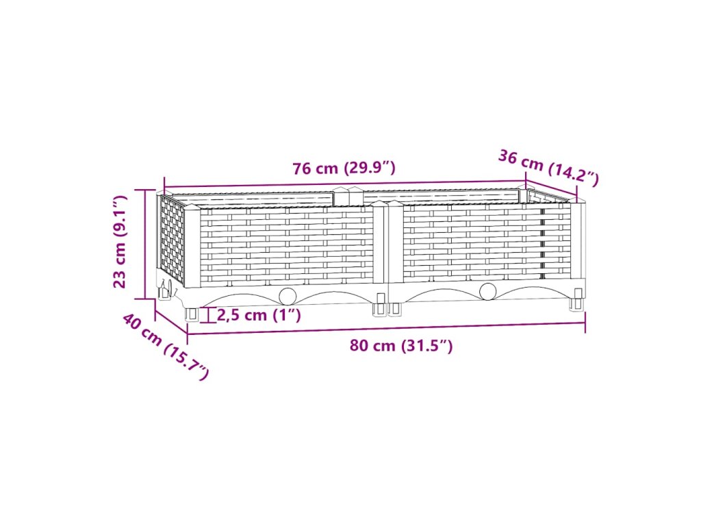 Truhlík je vyrobený z polypropylenu, takže je robustní, má dlouhou životnost a hodí se pro venkovní použití. Je dostatečně hluboký a široký, aby pojal velké množství půdy, a vejde se vám do něj celá řada rostlin, bylinek, květin i zeleniny. Vytvořte svým rostlinám ideální prostředí s tímto elegantním vyvýšeným záhonem!