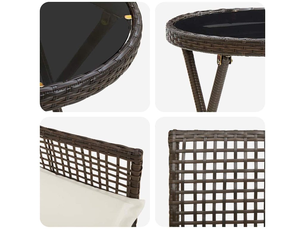 - Prémiová konstrukce z poly ratanu: Tato bistro sada je vyrobena z odolného poly ratanu, což jí zajišťuje styl a trvalost. Materiál je známý svou odolností vůči povětrnostním vlivům a zaručuje, že sada bude vypadat skvěle po celý rok. Naprosto bezstarostná, ideální pro busy majitele domů.