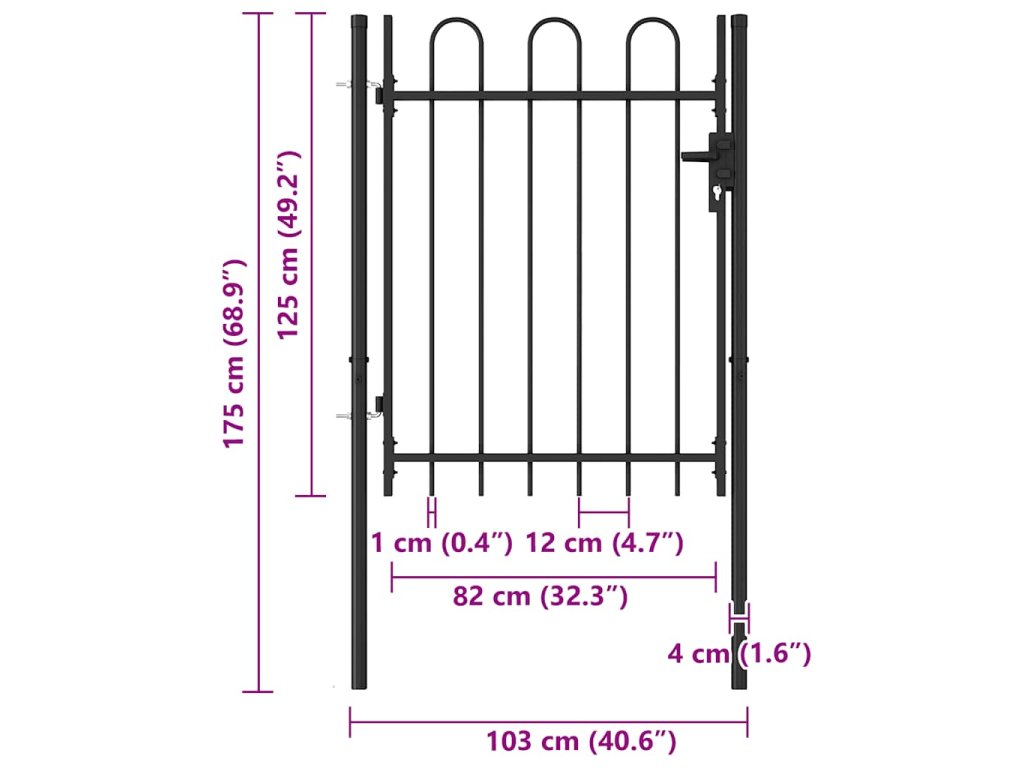 Zahradní branku tvoří svislé pruty nahoře zakončené obloukem a pevné vodorovné výztuhy, které rám zpevňují. Brána zaručuje vysoký stupeň soukromí a bezpečnosti a zároveň vytváří atraktivní vstup na váš pozemek. Je vyrobená z vysoce odolné oceli ošetřené práškovým lakem, který bránu chrání před rezavěním a korozí.