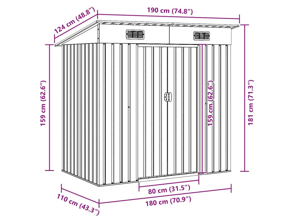 - Odolný materiál: Díky pozinkované oceli odolné proti korozi je skladovací domek robustní, odolný a vyrobený pro dlouhou životnost.