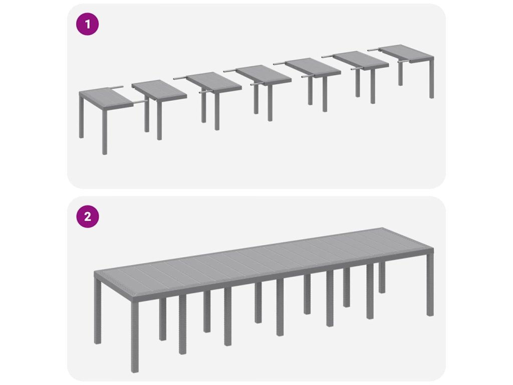 - Sofistikovaný design: Tato zahradní jídelní souprava zosobňuje štíhlý a minimalistický styl, což z ní činí ideální doplněk pro moderní venkovní prostory. Její moderní estetičnost je definována čistými liniemi a obdélníkovým tvarem, který bezproblémově zapadá do různých dekorativních stylů, čímž zvyšuje jak funkci, tak formu ve vaší zahradě.