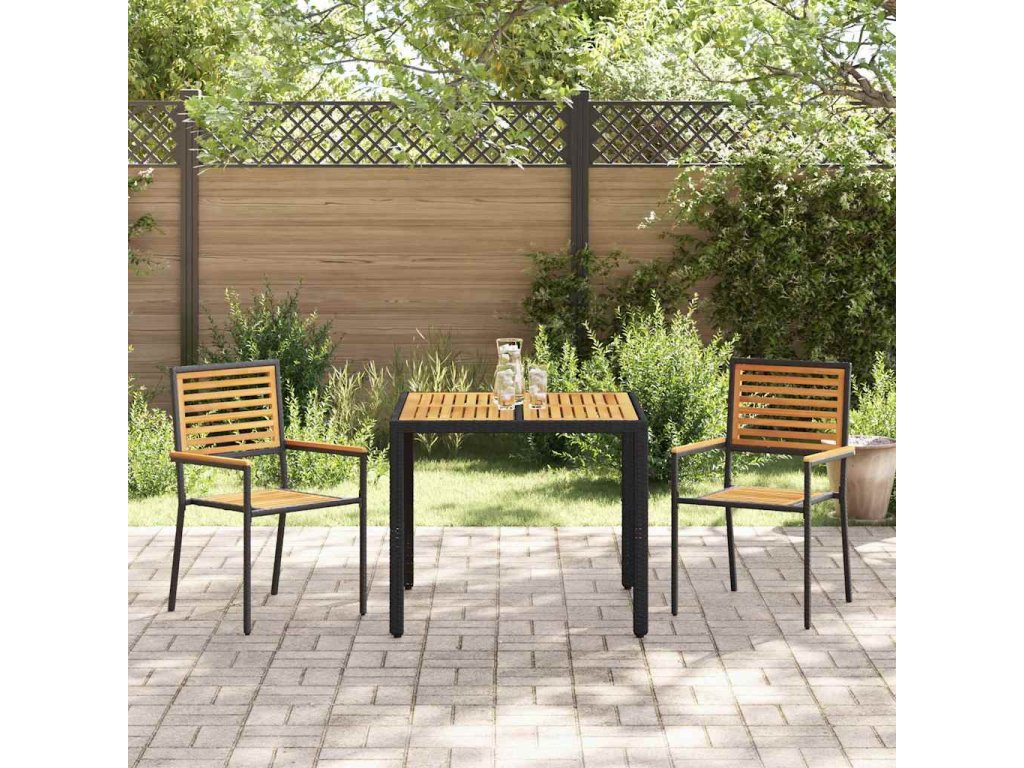 - Součásti setu: Všechny prvky jsou navrženy tak, aby zlepšily zážitek při jídle. Ploché opěrky z akáciového dřeva a pohodlné sedáky z polyratanu zaručují maximální komfort. Detaily jsou pečlivě provedené a nohy mají design, který poskytuje skvělou stabilitu.