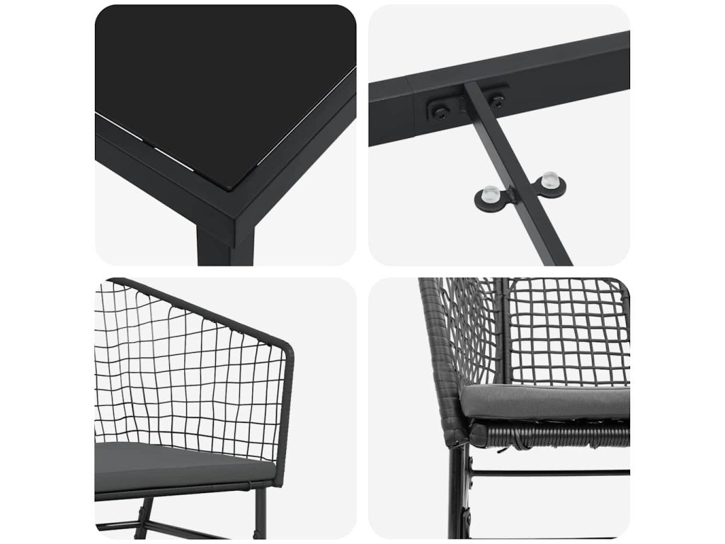 - Součásti: Set obsahuje odolný práškově lakovaný ocelový rám, který je základ šíření stability. Skleněný stůl je praktický a snadno se čistí. Polyratanové opěradla jsou pohodlná a ergonomická. Takže všechny prvky dohromady působí stylově a robustně.