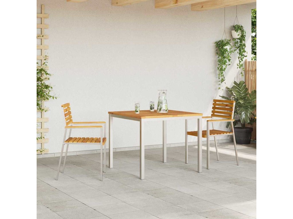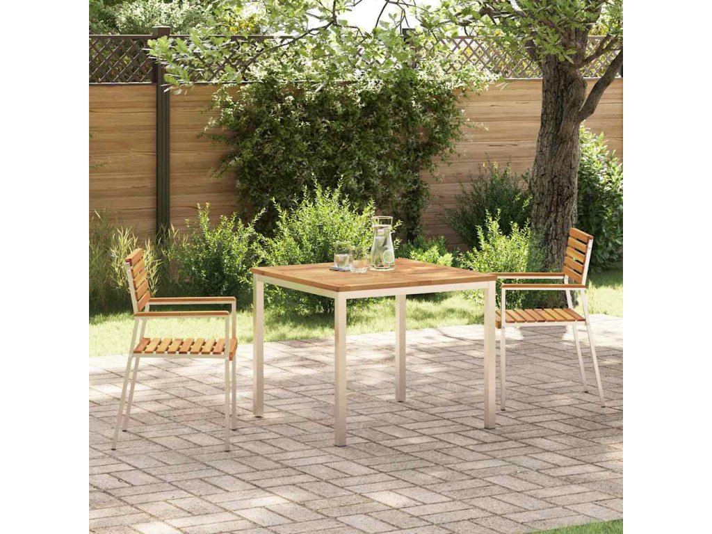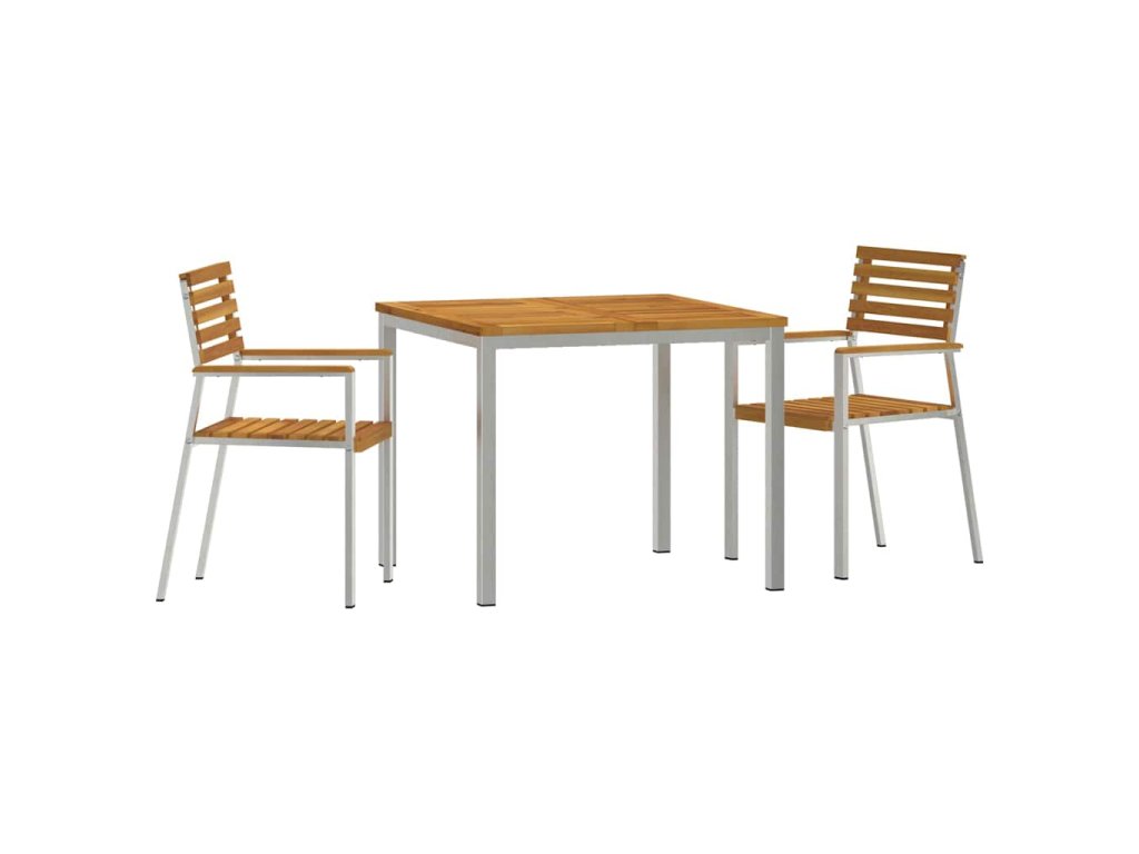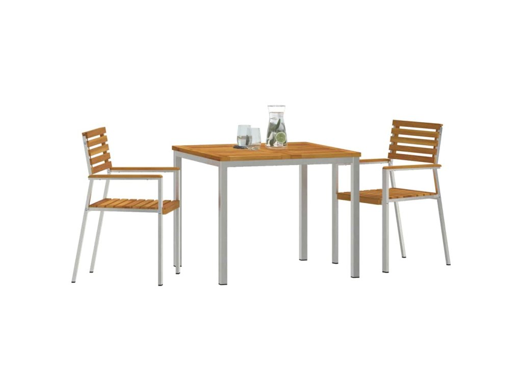 - Materiály: Jídelní set je z nerezové oceli, známé svojí pevností a odolností vůči špatnému počasí. Kvalitní ocelový rám zajišťuje stabilitu a dlouhou životnost. V kombinaci s dřevěným stolem je nejen hezký, ale i praktický pro jakékoliv počasí.