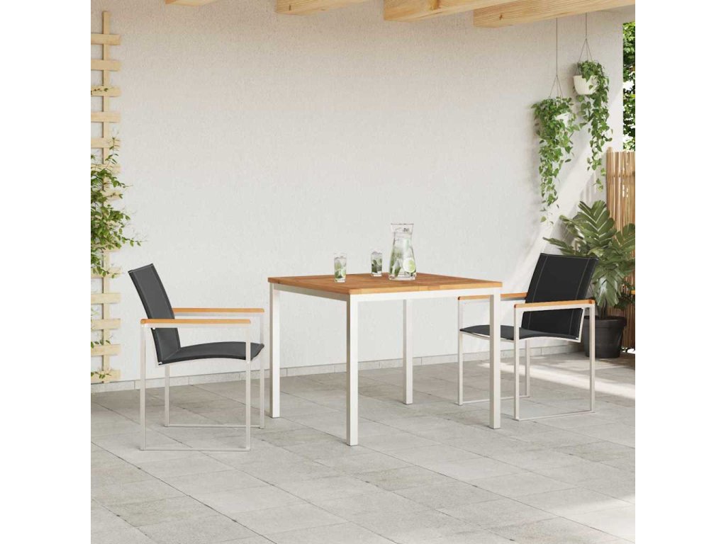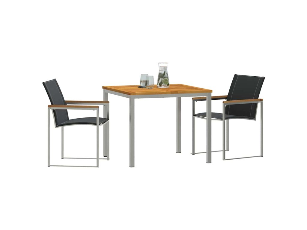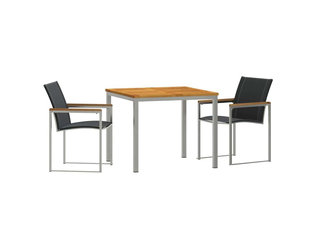 - Součásti: Set má ploché opěrky rukou pro pohodlné sezení a Textilene opěradla. Stabilitu díky nerezovým nohám. Odnímatelné polštáře se zipem nabízejí možnost přizpůsobení a snadnou údržbu.
