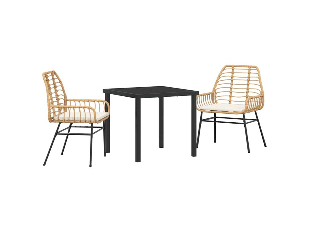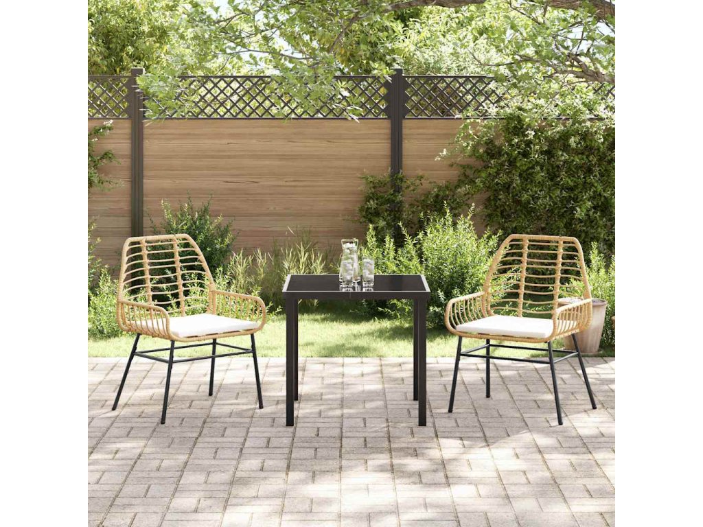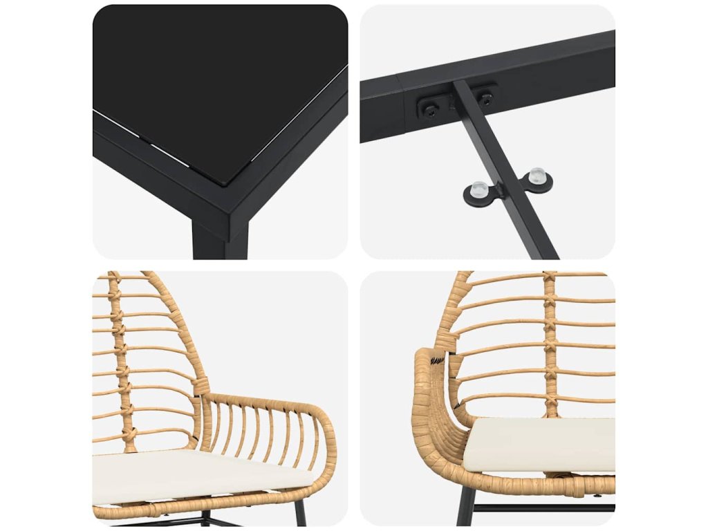 - Zahrnuté komponenty: Skleněné stolní desky jsou elegantní a trvanlivé. Opěrky z poly ratanu jsou pohodlné a stabilní nohy zaručují, že souprava je pevná na každém povrchu. Takže užijete si stylové venkovní stolování.