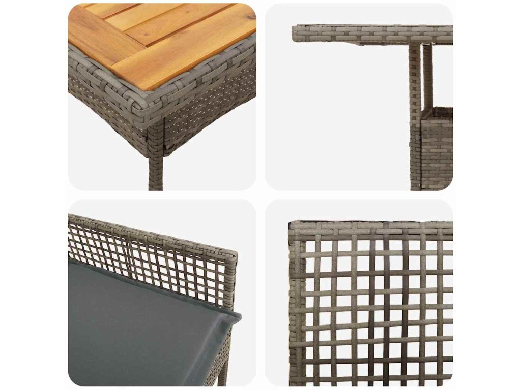 - Materiály: Tato jídelní souprava je převážně z poly ratanu, takže má hezký pletený vzhled, který skvěle funguje venku. Je odolná vůči počasí, takže vám vydrží i v různých podmínkách. Pevná akáciová deska dodává teplý nádech a zaručuje příjemné stolování.