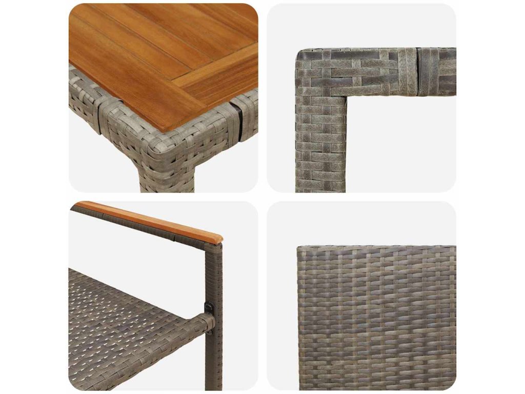 - Pokročilé komponenty: Ergonomické sezení s leštěným opěradlem dodává na komfortu. Teplé akáciové dřevo nabídne příjemný dotyk k modernímu poly ratanu.