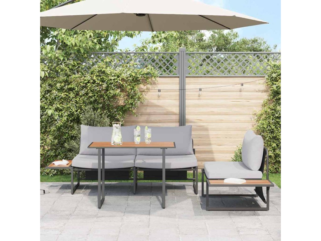 Tato moderní zahradní jídelní souprava je určena pro zahrady a terasy a perfektně spojuje moderní design s praktickým využitím, což ji činí ideální na venkovní setkání a rodinná jídla. Svým elegantním vzhledem nabízí stylové stolování, ale i odolnost vůči špatnému počasí, takže se vždy vyplatí. Představte si večerní večeře pod hvězdami, kdy vám tenhle set dodá vaší venkovní relaxační zóně veškerou sofistikovanost a jednoduchost.