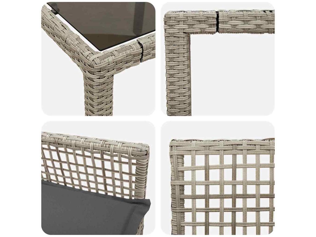 - Materiály: Tato sada je vyrobená z poly ratanu, který je známý svou pevností a stylovým vzhledem. Tvrzené sklo stolu dodává moderní vibe a je odolné vůči povětrnostním podmínkám.