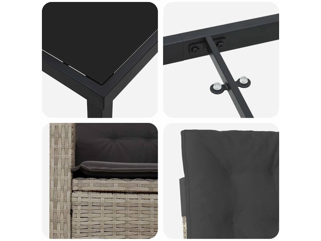 - Odolná konstrukce: Tento set je ze poly ratanu a má ocelové nohy, které poskytují stabilní základy a zajišťují dlouhou životnost. Materiály jsou odolné proti počasí, takže váš jídelní set zůstane v super stavu rok co rok.
