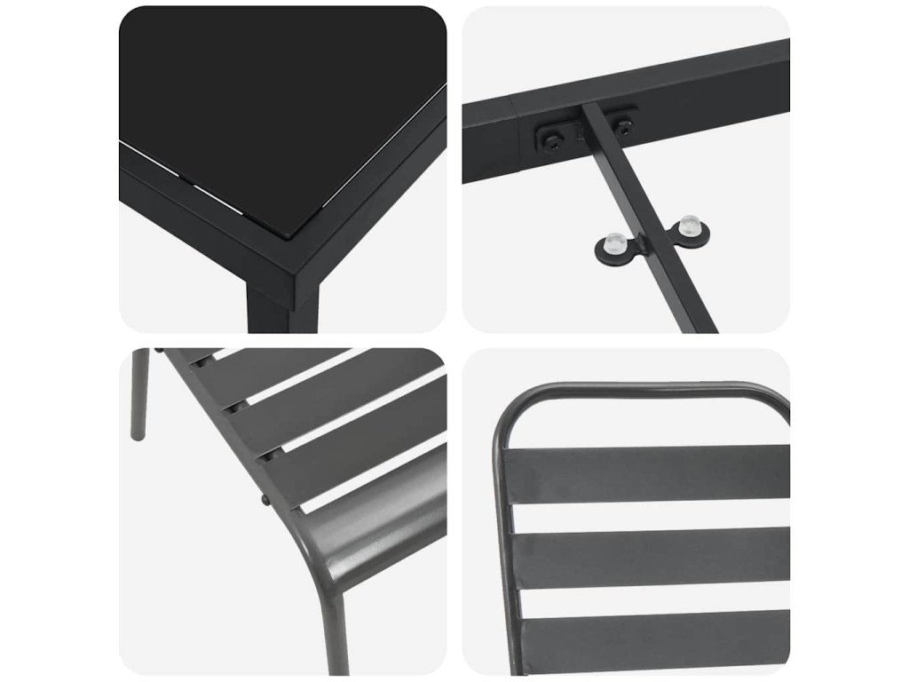 - Práškově lakovaná ocelová konstrukce: Vyrobeno z kvalitní práškově lakované oceli, tento jídelní set je navržen tak, aby byl odolný a trvanlivý. Odolný vůči UV záření a povětrnostním podmínkám, set si udržuje svou robustnost a estetický vzhled v různých venkovních podmínkách. Jeho pevná konstrukce zaručuje spolehlivé sezení, což ho činí skvělým pro časté používání a společenské příležitosti.