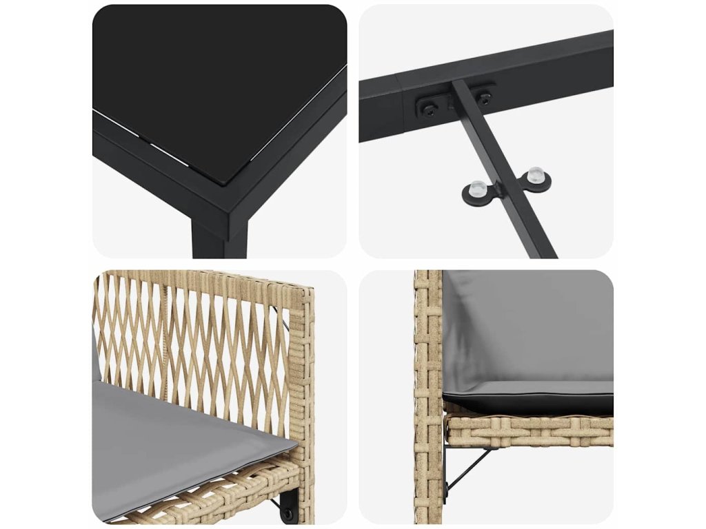- Obsah sady: Sada obsahuje pohodlné židle s poly ratanovými opěradly pro větší podporu. Ochranné opěrky nejsou jen stylové, ale i komfortní. Prostorný stůl se skleněnou deskou dodává eleganci a je snadno udržovatelný.