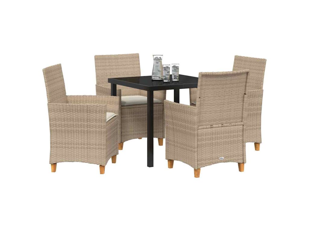 - Součásti: Set obsahuje kuželovité dřevěné nohy a opěrky s polyratanovými zádovými opěrkami, které přidávají styl a maximální pohodlí. Také obsahuje polyratanové polštáře s lehkou pěnou, které jsou flexibilní a podpůrné, skvělé na dlouhé používání.