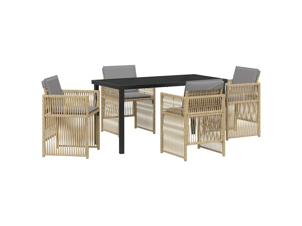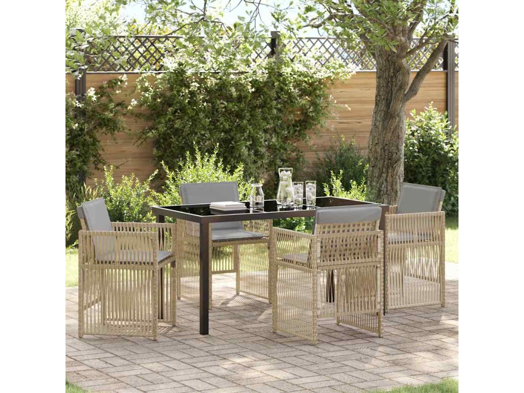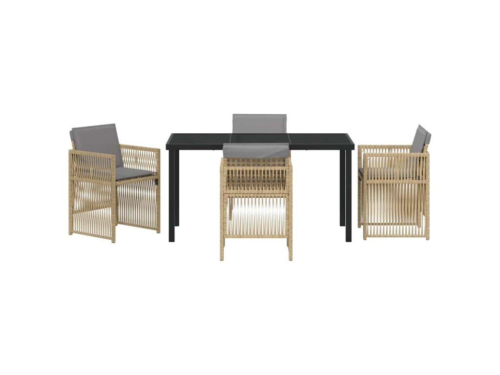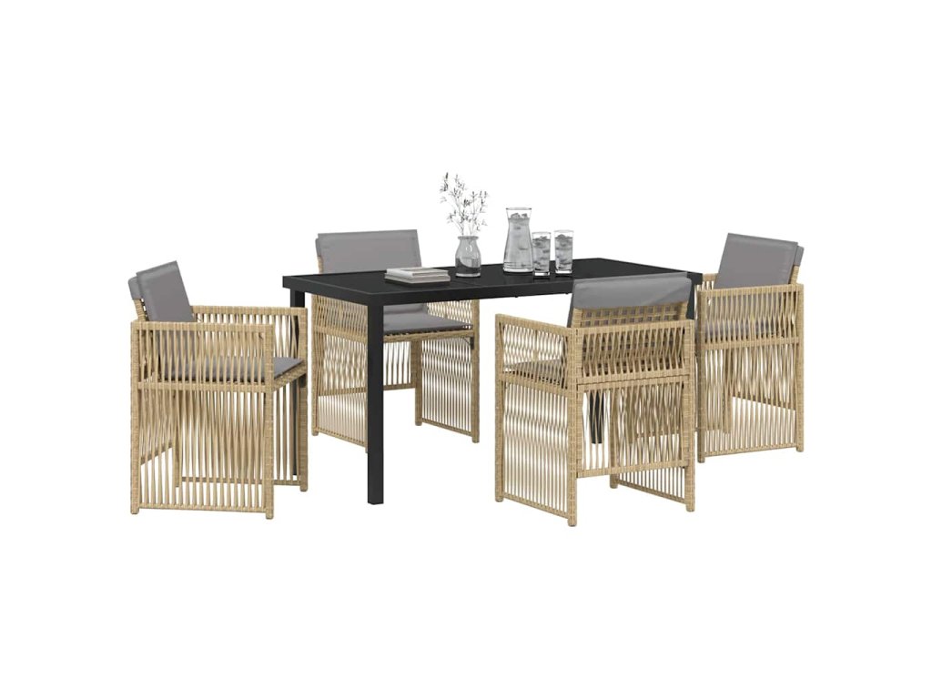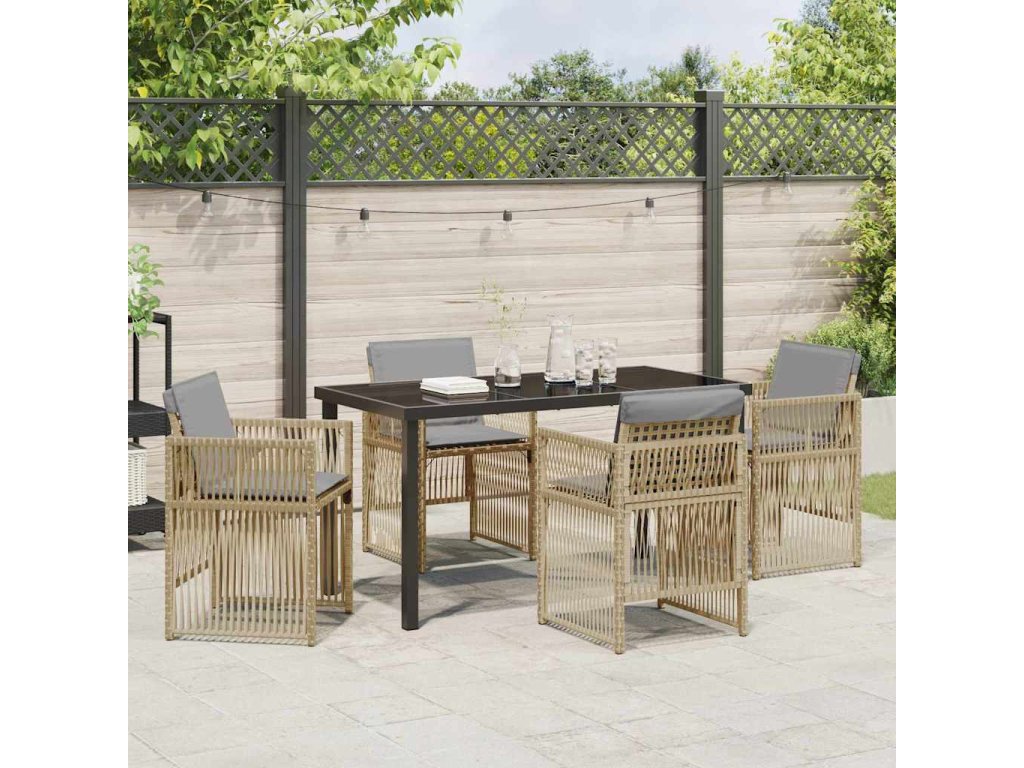 - Materiály: Tento moderní zahradní jídelní set je vyroben z práškově lakované oceli, což zajišťuje pevnost i odolnost vůči povětrnostním podmínkám. Tím se set stává dlouhotrvajícím centrem vašich venkovních prostor. Poly ratan na opěrkách navíc zvýrazňuje pohodlí a styl celého setu.