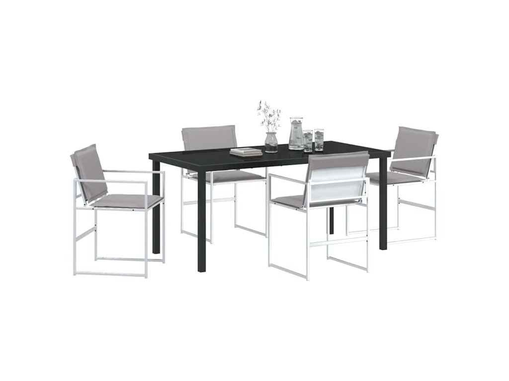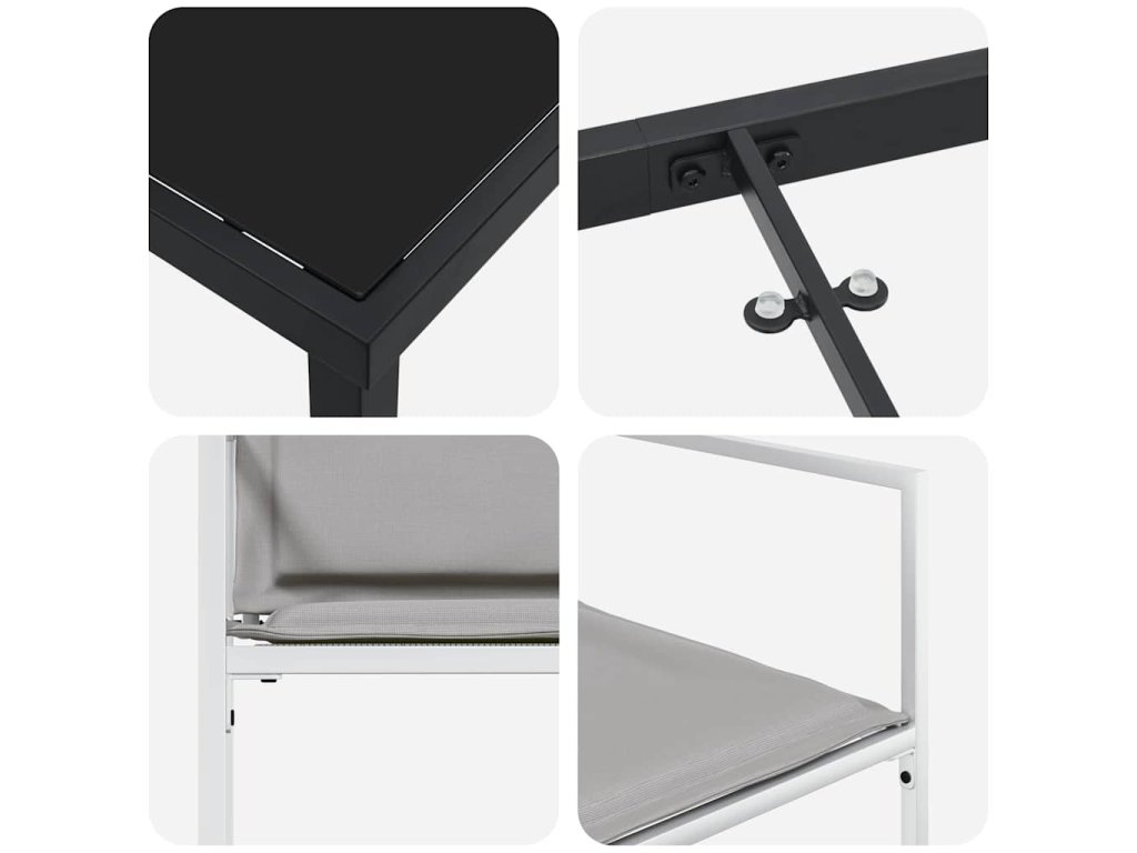 - Materiály: Sada je vyrobená z textilního materiálu, který rychle schne a je dost odolný, takže se pohodlně používá a vydrží. Tvrzené sklo na stole dodává povrchu atraktivní vzhled a zajišťuje bezpečnost. Práškově lakované ocelové rámy jsou robustní a vydrží venkovní povětrnostní podmínky, což zajišťuje stabilní oporu během jakéhokoli setkání.