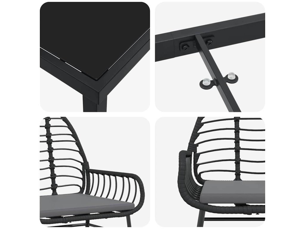 - Zahrnuté komponenty: Skleněné stolní desky jsou elegantní a trvanlivé. Opěrky z poly ratanu jsou pohodlné a stabilní nohy zaručují, že souprava je pevná na každém povrchu. Takže užijete si stylové venkovní stolování.