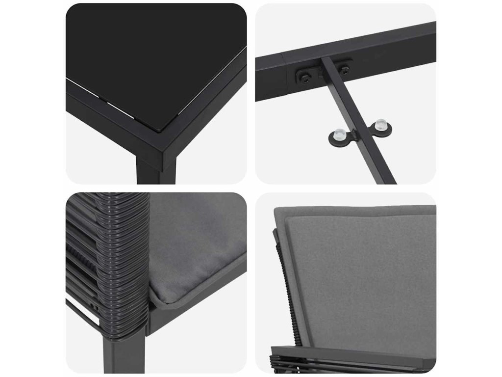 - Materiály: Vyrobený z poly ratanu, spojuje přírodní vzhled s moderní trvanlivostí pro dlouhotrvající venkovní vzhled. Tvrzené sklo zvyšuje eleganci setu a usnadňuje údržbu. Práškově lakované ocelové rámy jsou odolné proti počasí a vypadají dobře i po dlouhém slunění.