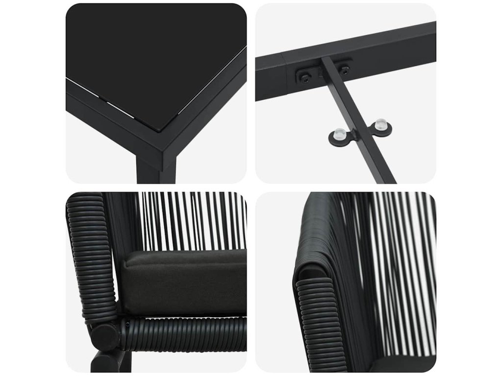 Tato moderní zahradní jídelní sada skvěle mixuje styl a funkčnost. Elegantní křivky a minimum dekorací z ní dělají ideální volbu na jarní a letní akce na vaší zahradě nebo terase. Je vytvořená pro venkovní používání a její krásné černé provedení vypadá velmi stylově, což promění jakýkoliv venkovní prostor na útulné místo pro romantické večeře nebo party s přáteli.
