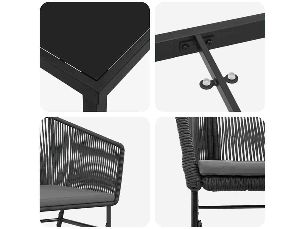 - Materiály: Hlavním prvkem je práškově lakovaná ocel, díky které je jídelní set odolný a moderní. Snadno se udržuje a vypadá skvěle. Tvrzené skleněné desky nejen dodávají vzhled, ale zajišťují trvalou krásu. To vše garantuje jak odolnost, tak i styl do každého venkovního prostoru.