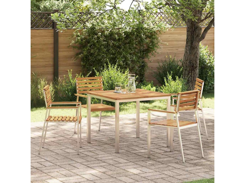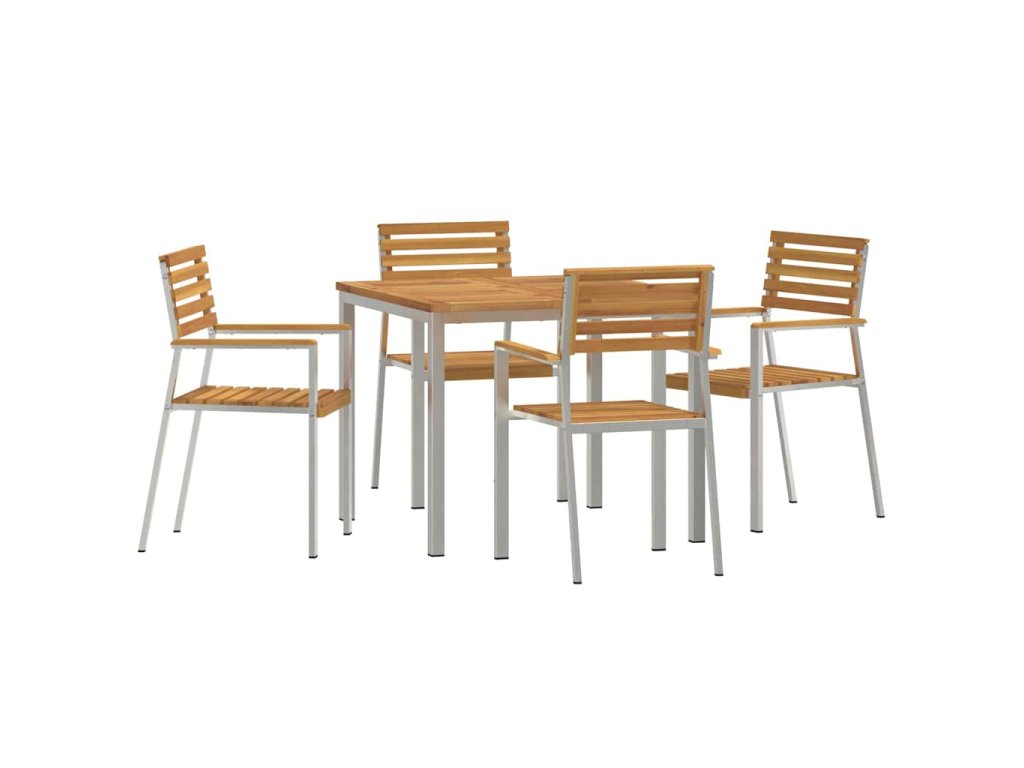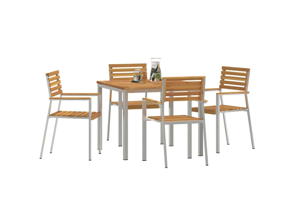 - Materiály: Jídelní set je z nerezové oceli, známé svojí pevností a odolností vůči špatnému počasí. Kvalitní ocelový rám zajišťuje stabilitu a dlouhou životnost. V kombinaci s dřevěným stolem je nejen hezký, ale i praktický pro jakékoliv počasí.