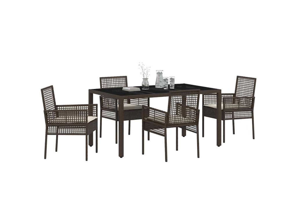 - Materiály: Tato sada je vyrobená z poly ratanu, který je známý svou pevností a stylovým vzhledem. Tvrzené sklo stolu dodává moderní vibe a je odolné vůči povětrnostním podmínkám.