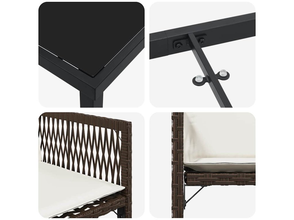- Obsah sady: Sada obsahuje pohodlné židle s poly ratanovými opěradly pro větší podporu. Ochranné opěrky nejsou jen stylové, ale i komfortní. Prostorný stůl se skleněnou deskou dodává eleganci a je snadno udržovatelný.