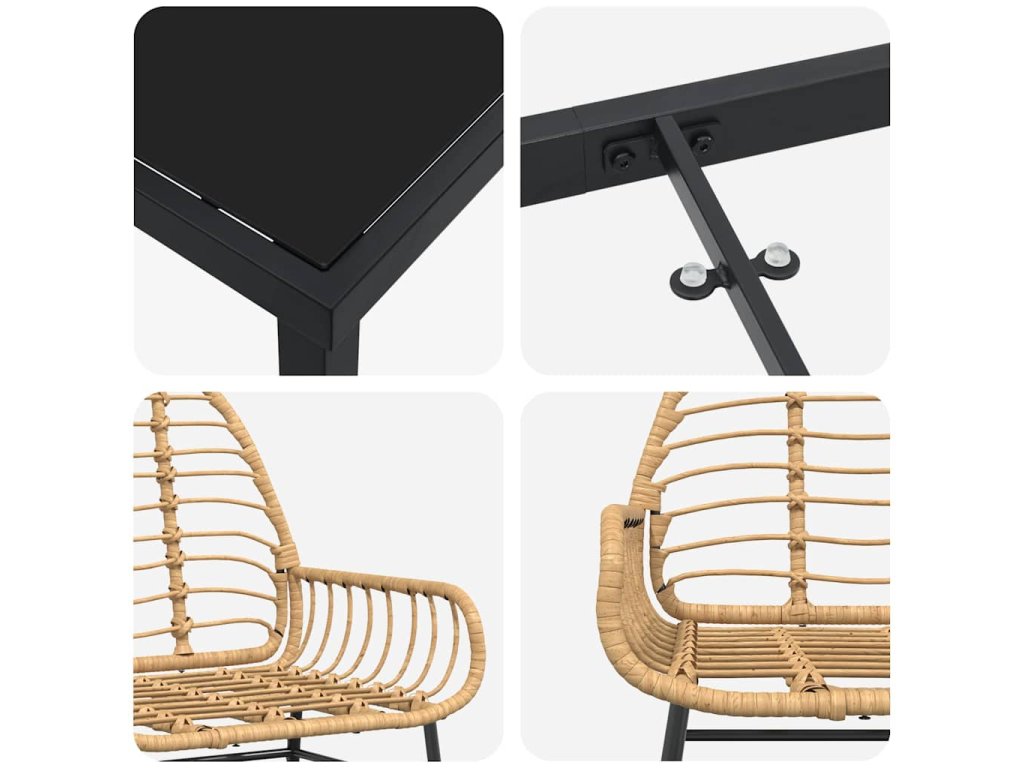 - Zahrnuté komponenty: Skleněné stolní desky jsou elegantní a trvanlivé. Opěrky z poly ratanu jsou pohodlné a stabilní nohy zaručují, že souprava je pevná na každém povrchu. Takže užijete si stylové venkovní stolování.