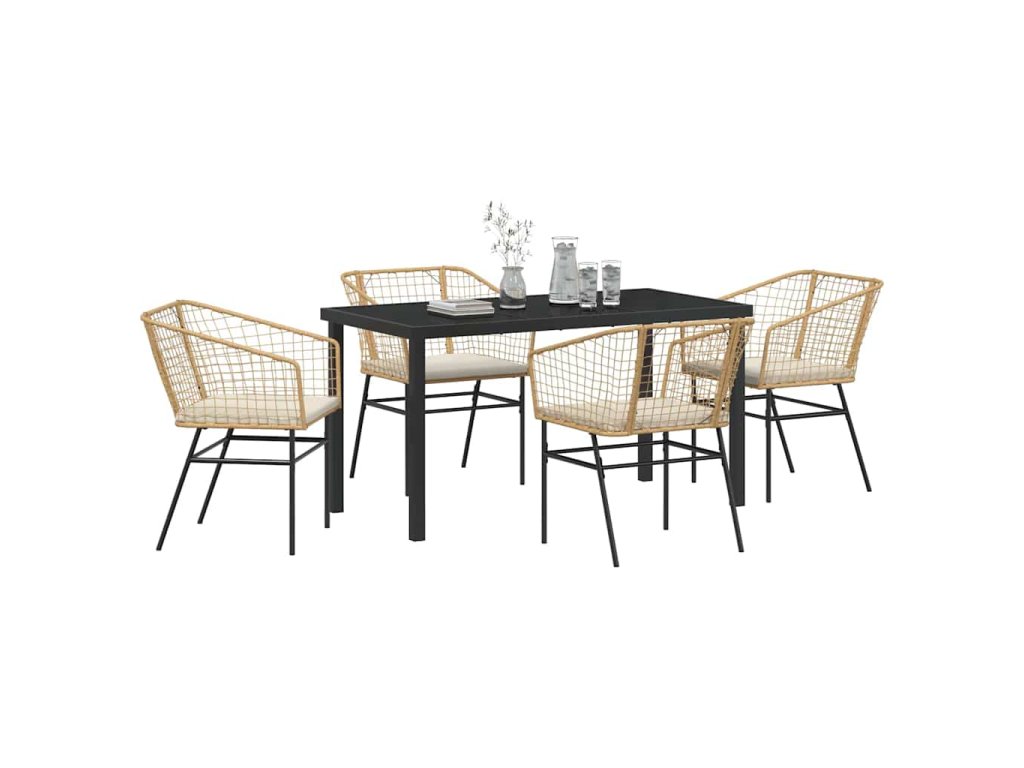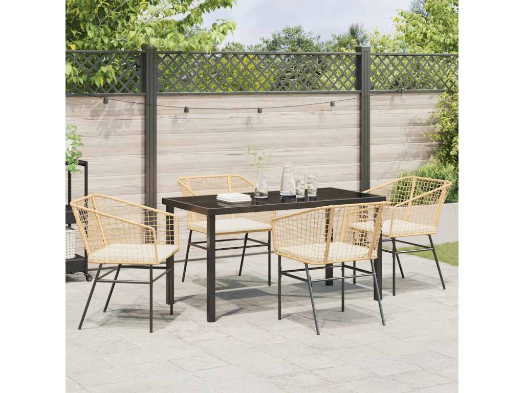 - Materiály: Tento skvělý jídelní set je primárně z poly ratanu, který je oblíbený díky své spolehlivosti a odolnosti vůči počasí. Práškově lakovaná ocel dodává silný rám, který zajišťuje stabilitu a dlouhou životnost. Skleněný povrch mu dodává elegantní vzhled, který se skvěle hodí do různých venkovních prostor a potřebuje minimální údržbu pro skvělý vzhled.