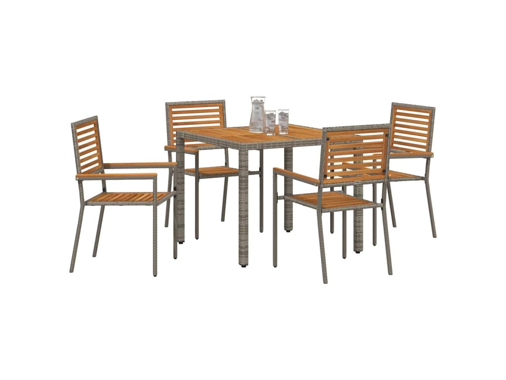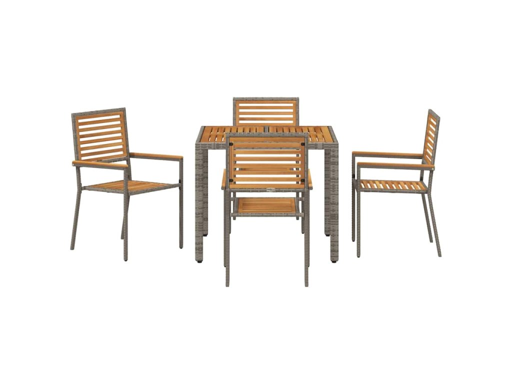 - Součásti setu: Všechny prvky jsou navrženy tak, aby zlepšily zážitek při jídle. Ploché opěrky z akáciového dřeva a pohodlné sedáky z polyratanu zaručují maximální komfort. Detaily jsou pečlivě provedené a nohy mají design, který poskytuje skvělou stabilitu.