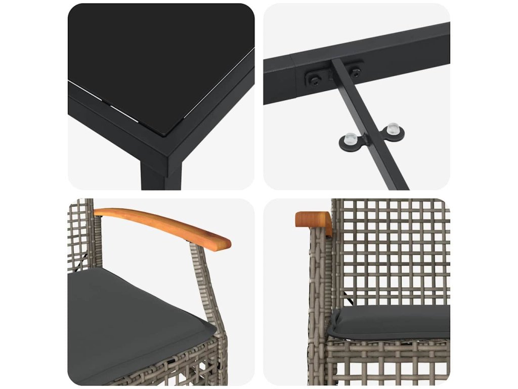 - Praktické funkce: S pevnými ocelovými nohami a rámy, každý kousek v tomto setu slibuje stabilitu a dlouhou životnost. Akáciové opěrky rukou skvěle ladí s pohodlnými poly ratanovými opěradly, takže to má jak hezký vzhled, tak funkčnost pro venkovní stolování.