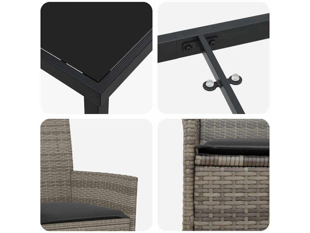 - Materiály: Tenhle jídelní set má skvělou kombinaci polyratanu, oceli a skla. Polyratan odolává špatnému počasí, ideální pro venkovní použití. Ocelový rám poskytuje pevnou oporu a zajišťuje stabilitu. Skleněná deska dodá modernímu stylu elegantní dotek.