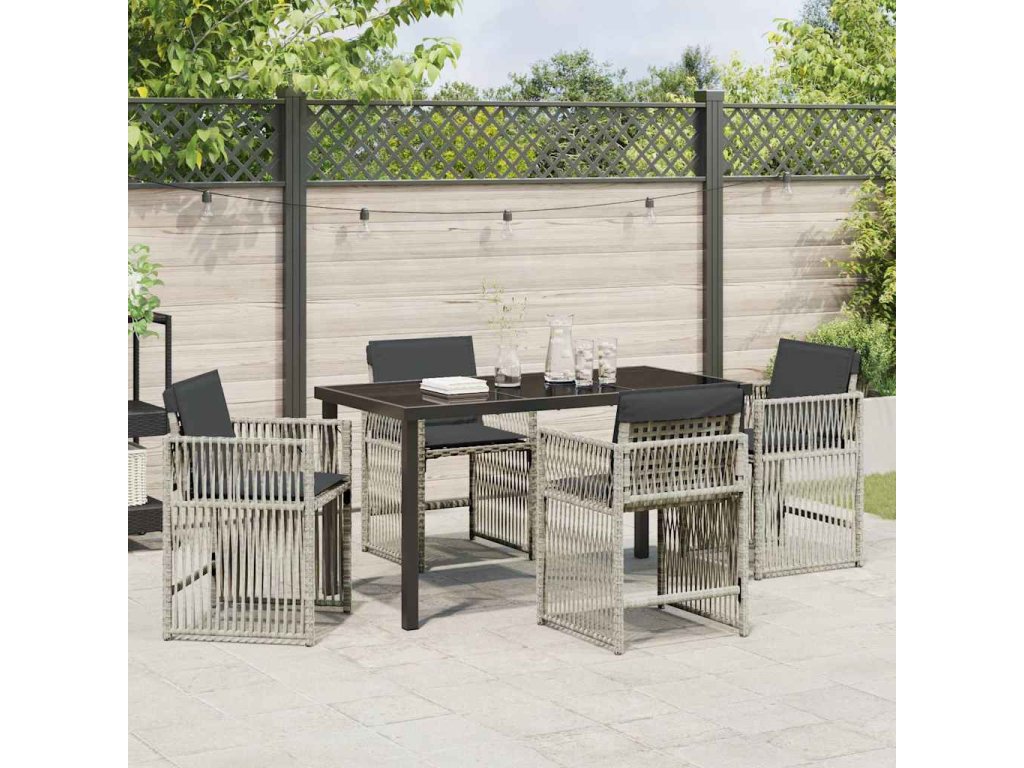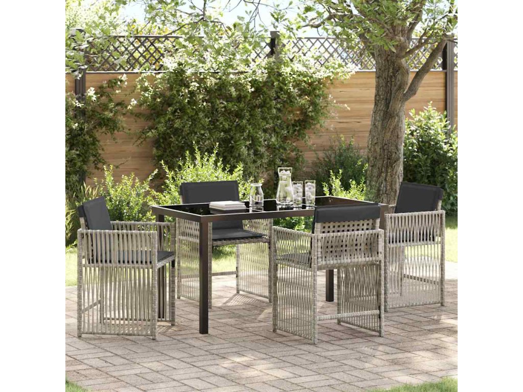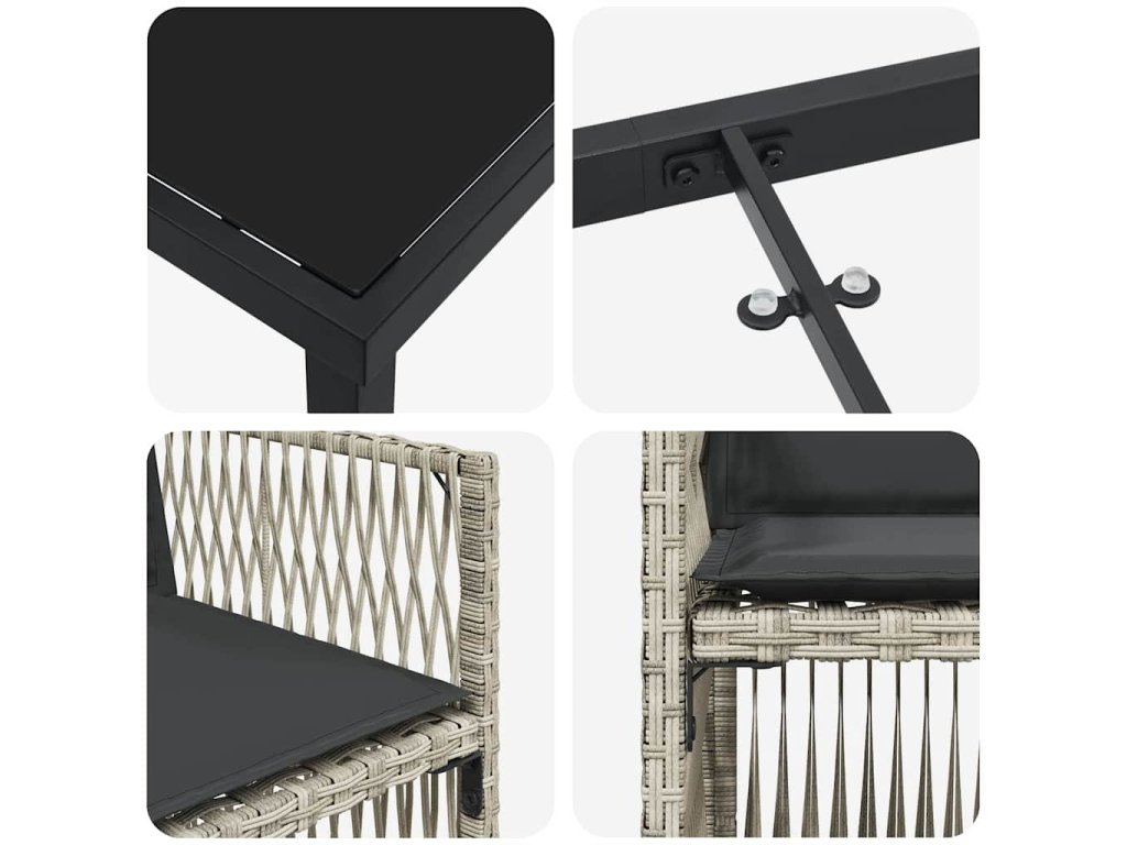 - Materiály: Tento moderní zahradní jídelní set je vyroben z práškově lakované oceli, což zajišťuje pevnost i odolnost vůči povětrnostním podmínkám. Tím se set stává dlouhotrvajícím centrem vašich venkovních prostor. Poly ratan na opěrkách navíc zvýrazňuje pohodlí a styl celého setu.