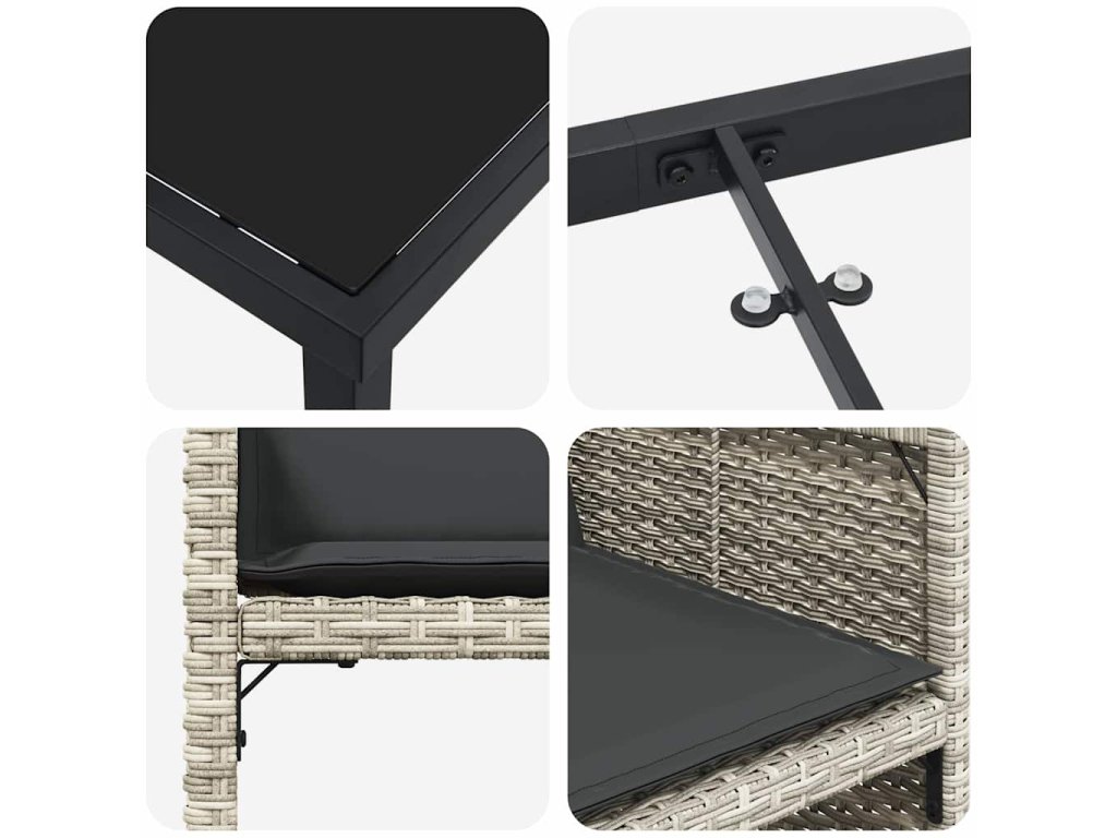 - UV odolný poly ratan: Poly ratan zajišťuje odolnost vůči slunci a uchovává si barvu a strukturu i po letech. Jeho povrch je příjemný na dotek a ladí s moderním stylem vašeho venkovního prostoru.