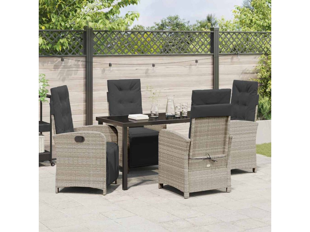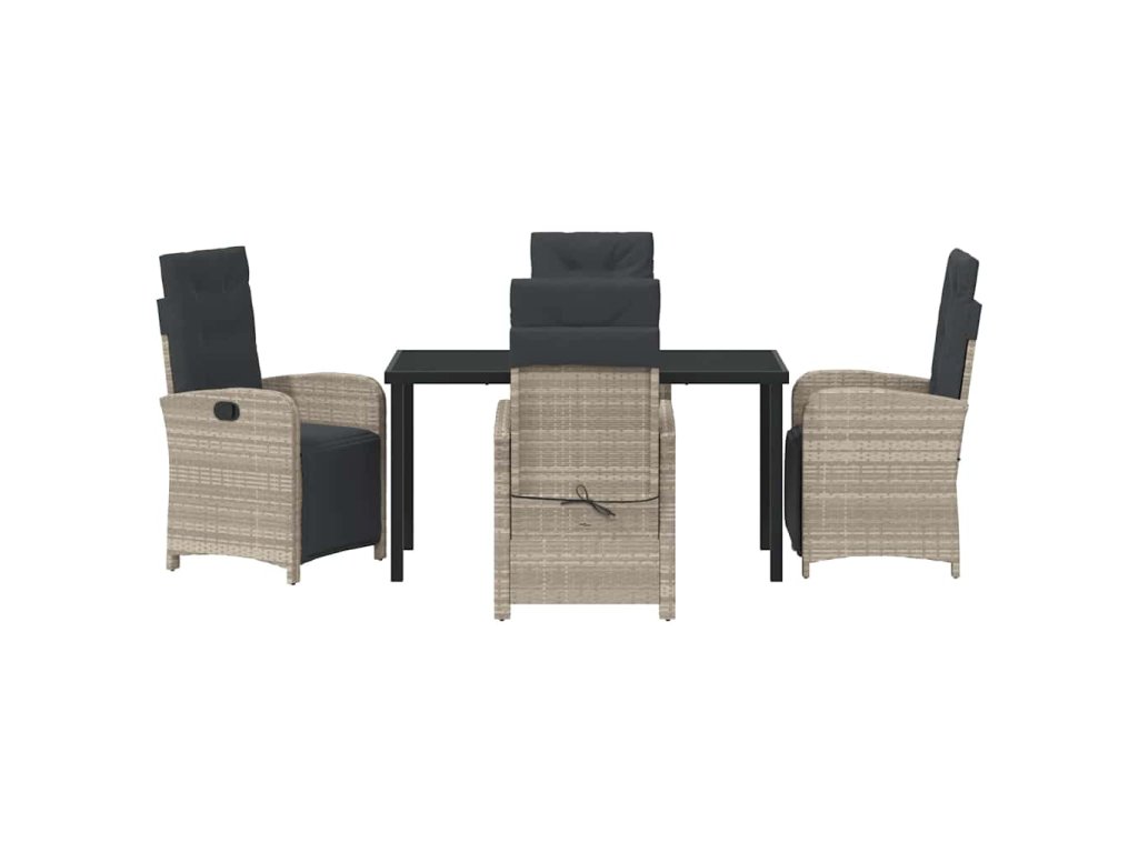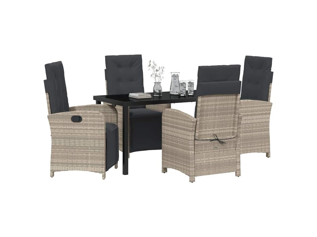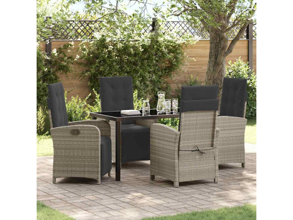 - Funkční komponenty: Vyleštěná skleněná deska dodává setu styl a usnadňuje údržbu. Nastavitelné opěrky zad poskytují různé možnosti, jak si užít lenošení po jídle a přizpůsobují se potřebám vašich hostů.