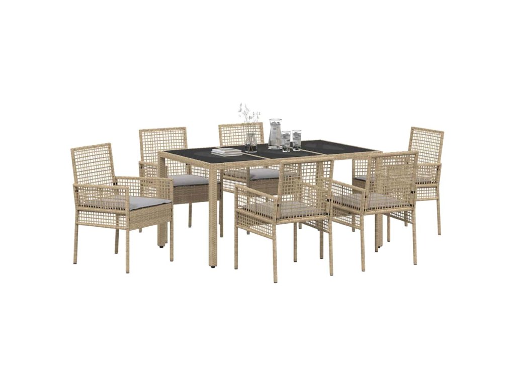 - Materiály: Tato sada je vyrobená z poly ratanu, který je známý svou pevností a stylovým vzhledem. Tvrzené sklo stolu dodává moderní vibe a je odolné vůči povětrnostním podmínkám.