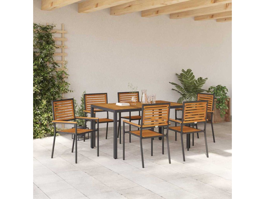 - Součásti setu: Všechny prvky jsou navrženy tak, aby zlepšily zážitek při jídle. Ploché opěrky z akáciového dřeva a pohodlné sedáky z polyratanu zaručují maximální komfort. Detaily jsou pečlivě provedené a nohy mají design, který poskytuje skvělou stabilitu.