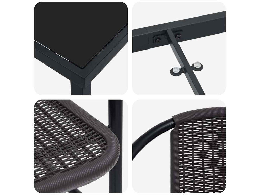 - Jasně definované komponenty: Tento set má dokonale zakřivená sedadla, která krásně vypadají ze všech stran. Práškově lakované opěrky zajišťují pohodlí a tvrzené skleněné desky vypadají sofistikovaně a dají se jednoduše čistit. Jsou ideální pro venkovní stravování.