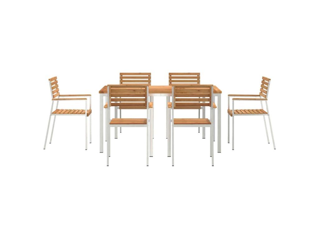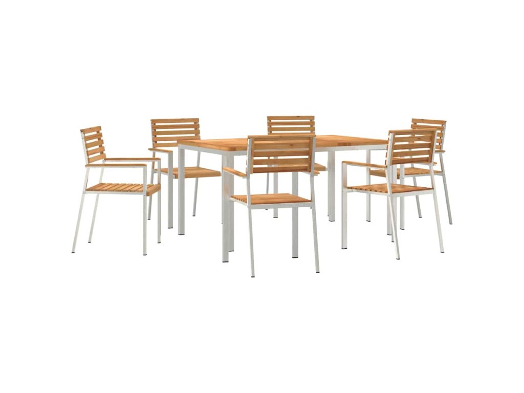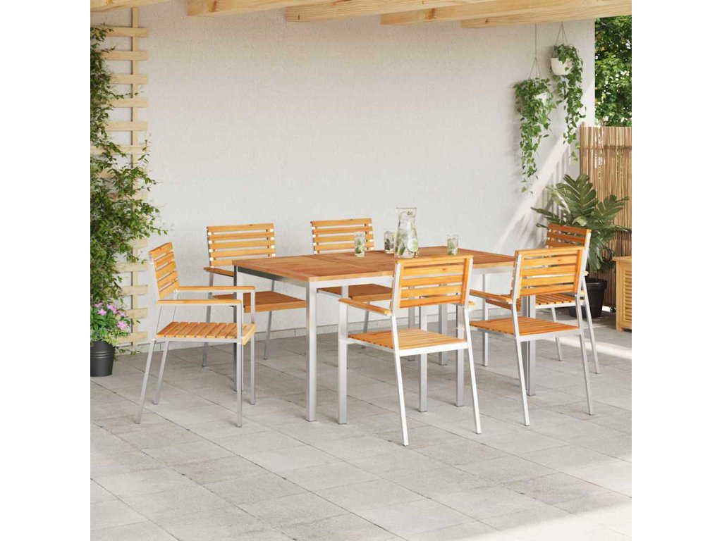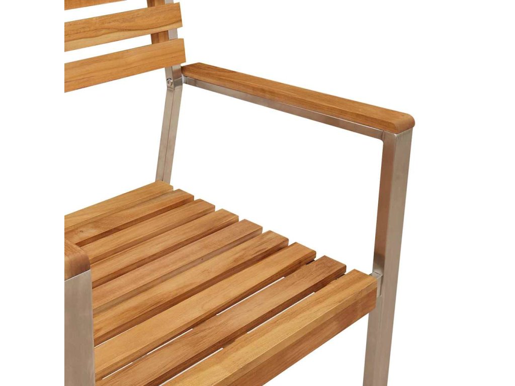 - Materiály: Jídelní set je z nerezové oceli, známé svojí pevností a odolností vůči špatnému počasí. Kvalitní ocelový rám zajišťuje stabilitu a dlouhou životnost. V kombinaci s dřevěným stolem je nejen hezký, ale i praktický pro jakékoliv počasí.
