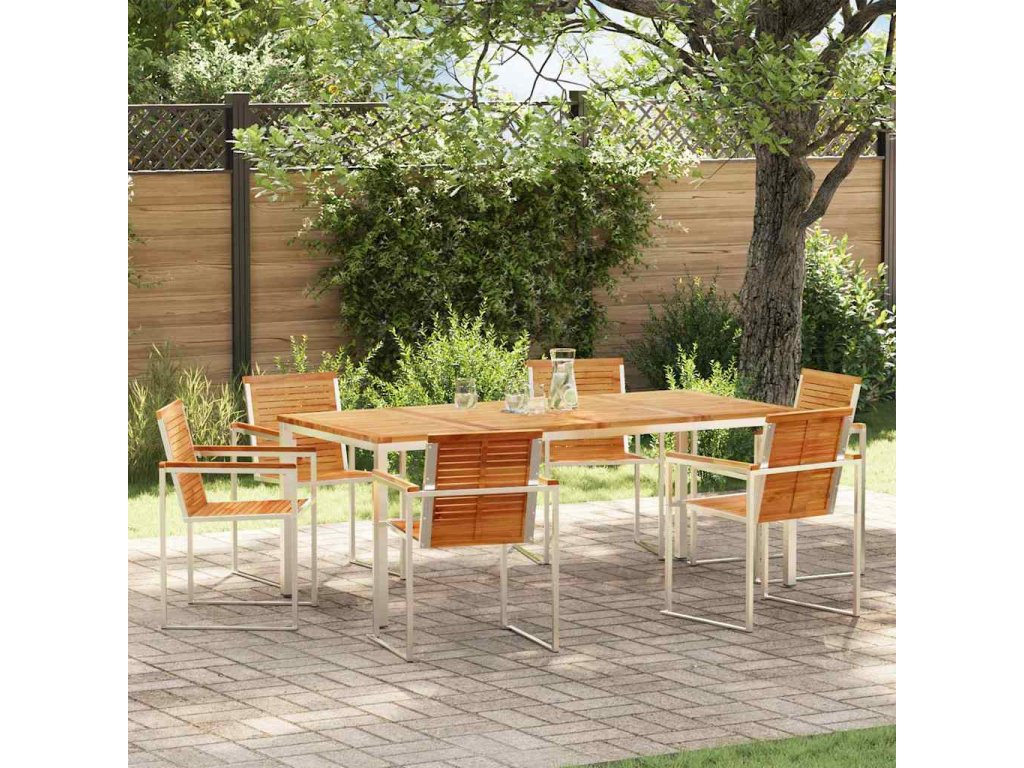 - Materiály: Tento venkovní jídelní set je vyroben z nerezové oceli, takže je super odolný vůči nepříznivému počasí a má dlouhou životnost s minimálními nároky na údržbu. Reflexní lesk oceli dodává šmrnc, který skvěle ladí s hnědými sedacími polštáři, a je to hezká volba pro moderní zahrady.