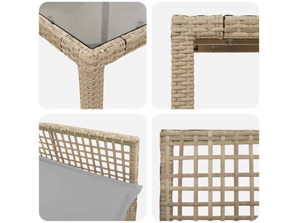 - Materiály: Tato sada je vyrobená z poly ratanu, který je známý svou pevností a stylovým vzhledem. Tvrzené sklo stolu dodává moderní vibe a je odolné vůči povětrnostním podmínkám.