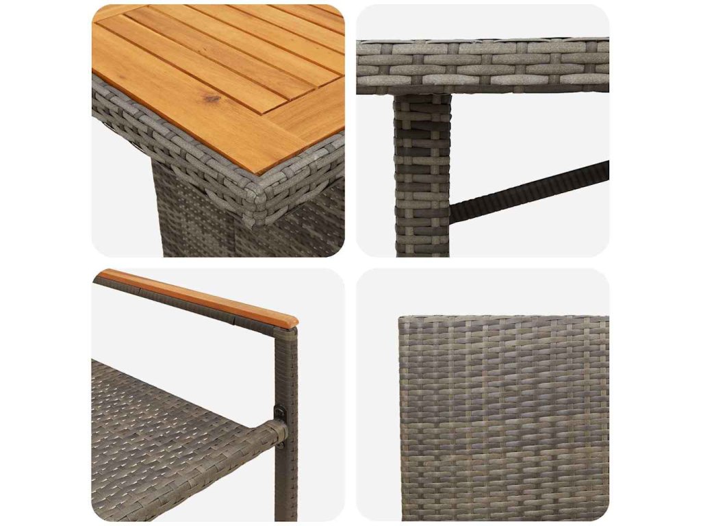 - Materiály: Zahradní jídelní souprava je vyrobená z poly ratanu, který je odolný proti špatnému počasí a každodennímu opotřebení. Tento materiál zajišťuje, že nábytek zůstane hezký a pevný po celou dobu jeho používání, takže vám poskytne pohodlí a trvanlivost, což ho činí ideálním pro venkovní použití.