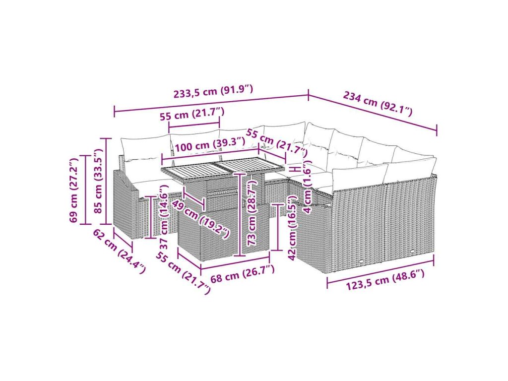 - Úložná funkčnost: Pečlivě navrženo s integrovanými úložnými prostory v područkách, rohových a středových sedadlech, nabízí praktické řešení pro organizaci polštářů a dalších nezbytností. Tato funkce přidává pohodlí, což činí ideální pro uklizené venkovní prostory.