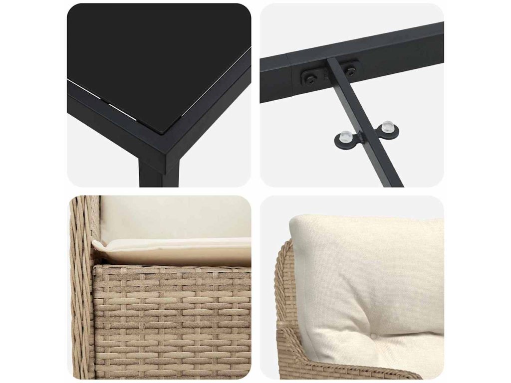 - Odolnost ve všech podmínkách Konstrukce z UV-odolného poly ratanu a práškově lakované oceli, set odolává jakémukoliv počasí. Materiály zajišťují dlouhověkost a udržují vzhled i funkčnost sezónu po sezóně.