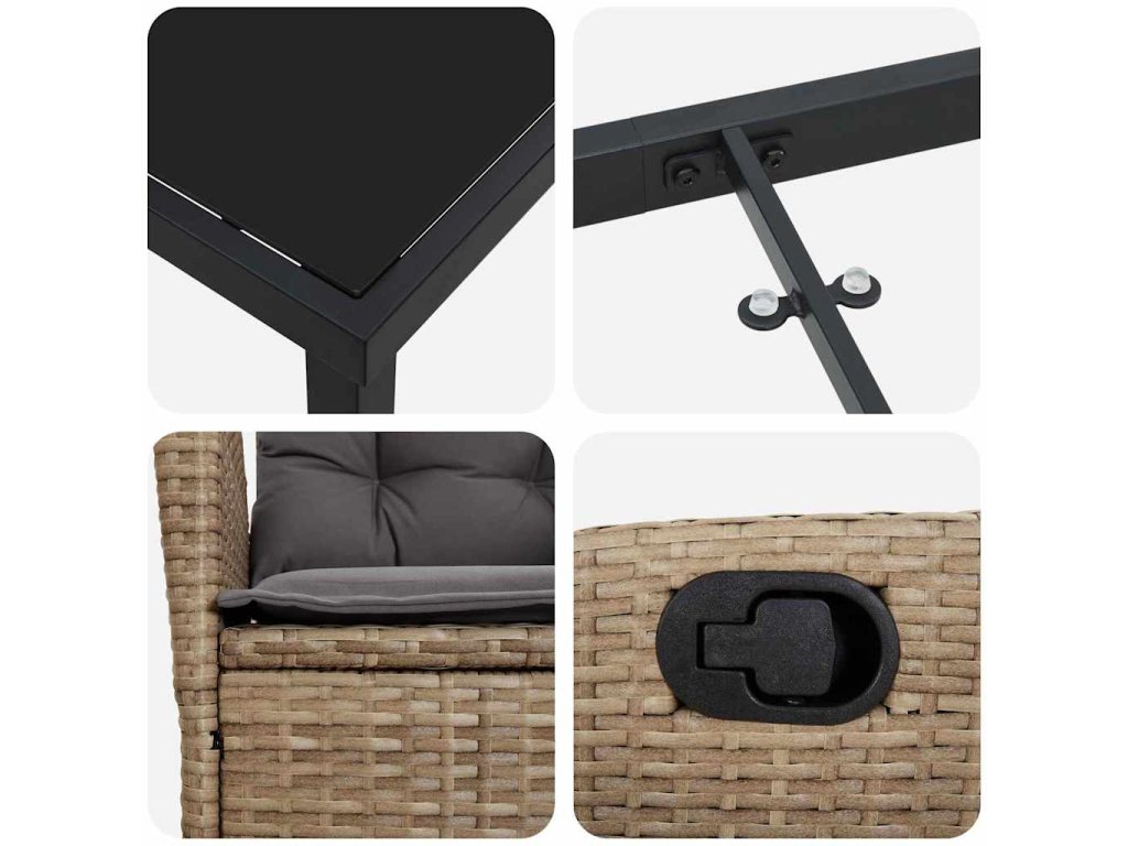 - Ochranné pokyny: Doporučujeme používat ochranný kryt, když set zrovna není používán, aby vydržel různé povětrnostní podmínky. Tato jednoduchá péče prodlouží životnost a krásu vašeho stylového zahradního setu, takže zůstane atraktivní po dlouhou dobu.