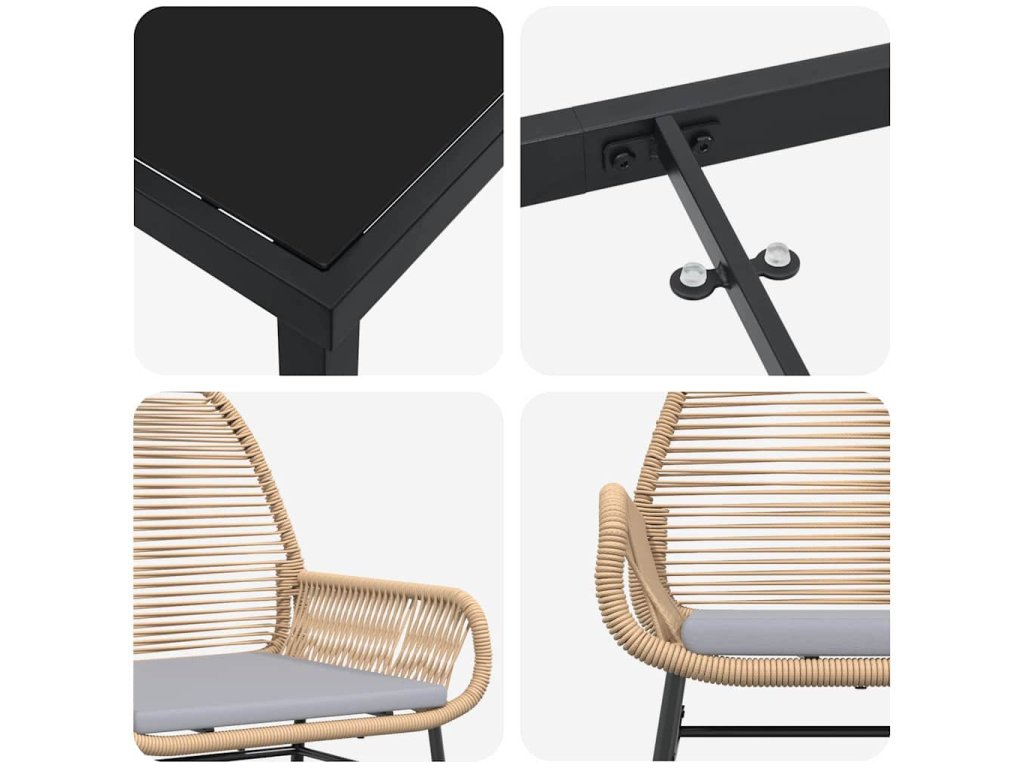 - Poly ratanový exteriér: Naše zahradní souprava má odolný poly ratan, co dobře snáší různé počasí. Je to materiál, který vypadá skvěle a dlouho vydrží.