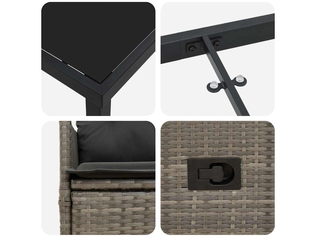 - Materiály z polyratanu Zahradní jídelní set je vyrobený z odolného polyratanu, který je UV stabilní a dlouho vydrží. Dlouho si zachovává skvělý vzhled, i za špatného počasí, takže je ideální pro venkovní použití. Textura a pocit polyratanu vytvářejí příjemnou atmosféru pro luxusní venkovní stolování.