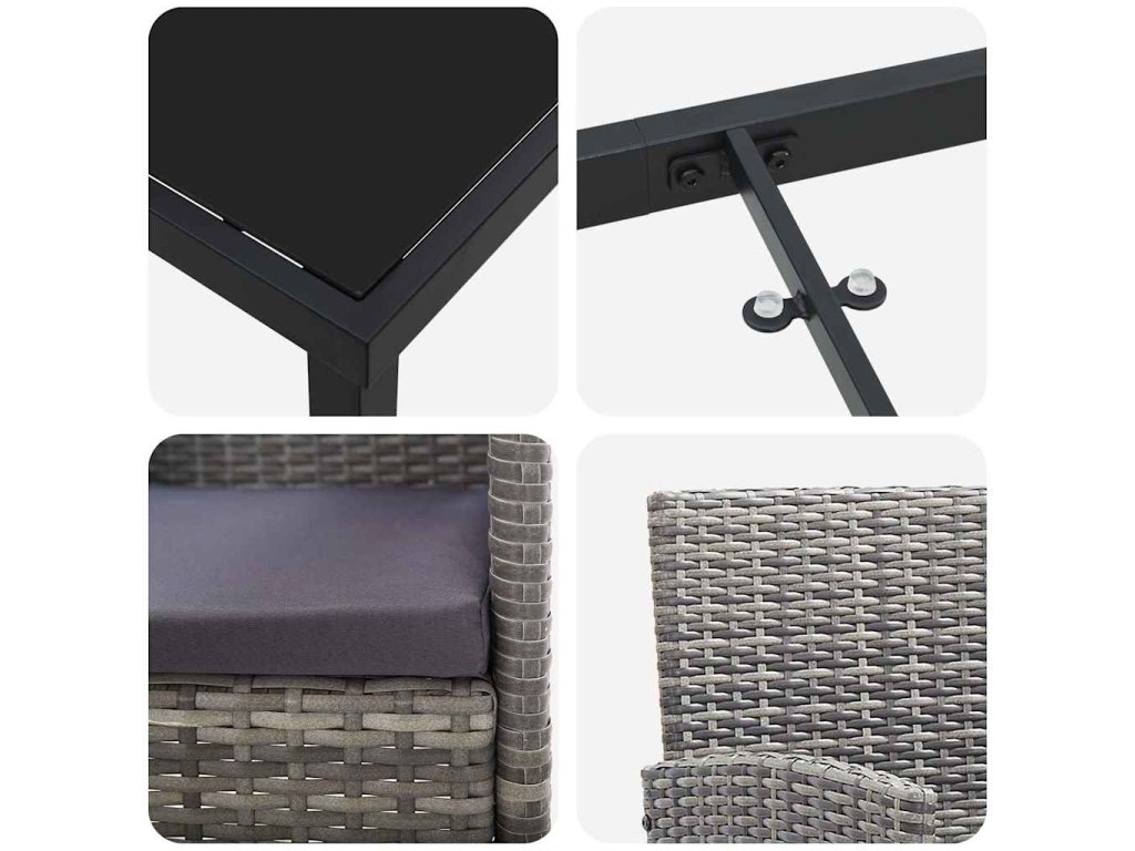 - Materiály: Tento jídelní set se pyšní odolným polyratanem a tvrzeným sklem, které odolávají povětrnostním vlivům. Tato kombinace skvěle vypadá a vydrží i tu nejhorší sezonu.