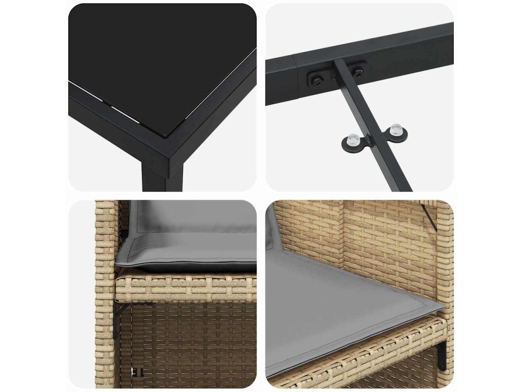 - Materiály: Set je ze polyratanu, známého svou odolností vůči počasí. Povrch stolu z tvrzeného skla je snadno omyvatelný a vypadá elegantně. Práškově lakovaná ocel posiluje rám a nohy, takže je to robustní konstrukce, která utáhne i drsnější podmínky.
